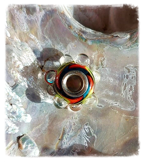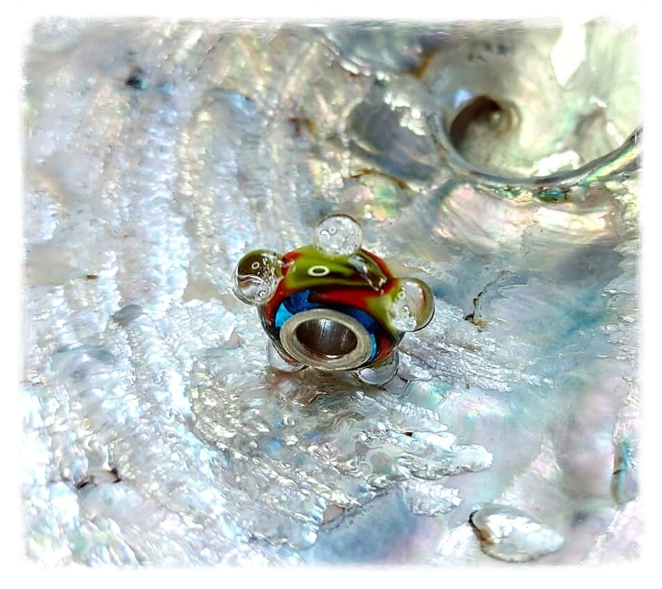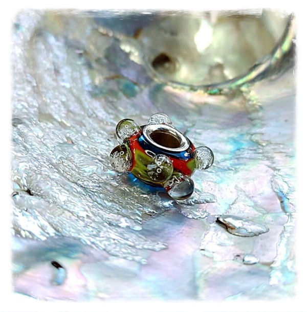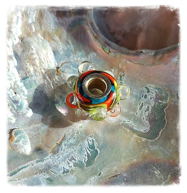 De basis van de kraal is gemaakt van een transparante kleur turqouise, met daar op een speciale oranje-geel-groene handvervaardigde glasstaaf.
